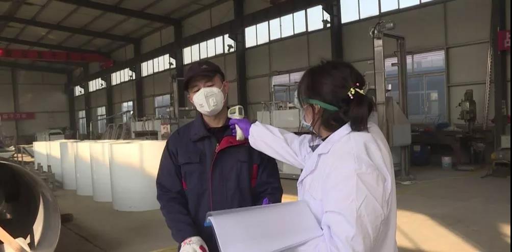 在煙臺茂源食品機械有限公司的大門口,公司安排了專門人員為進入廠區的工人進行體溫檢測,這是企業為切實防止人員流動和集聚帶來的交叉感染,有序做好企業復工后疫情防控工作的一項具體舉措。