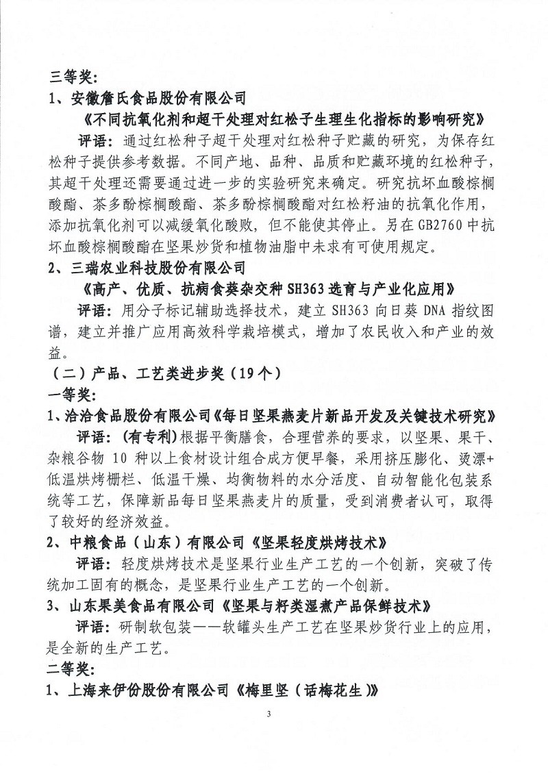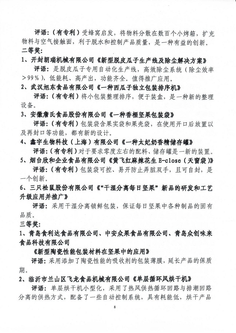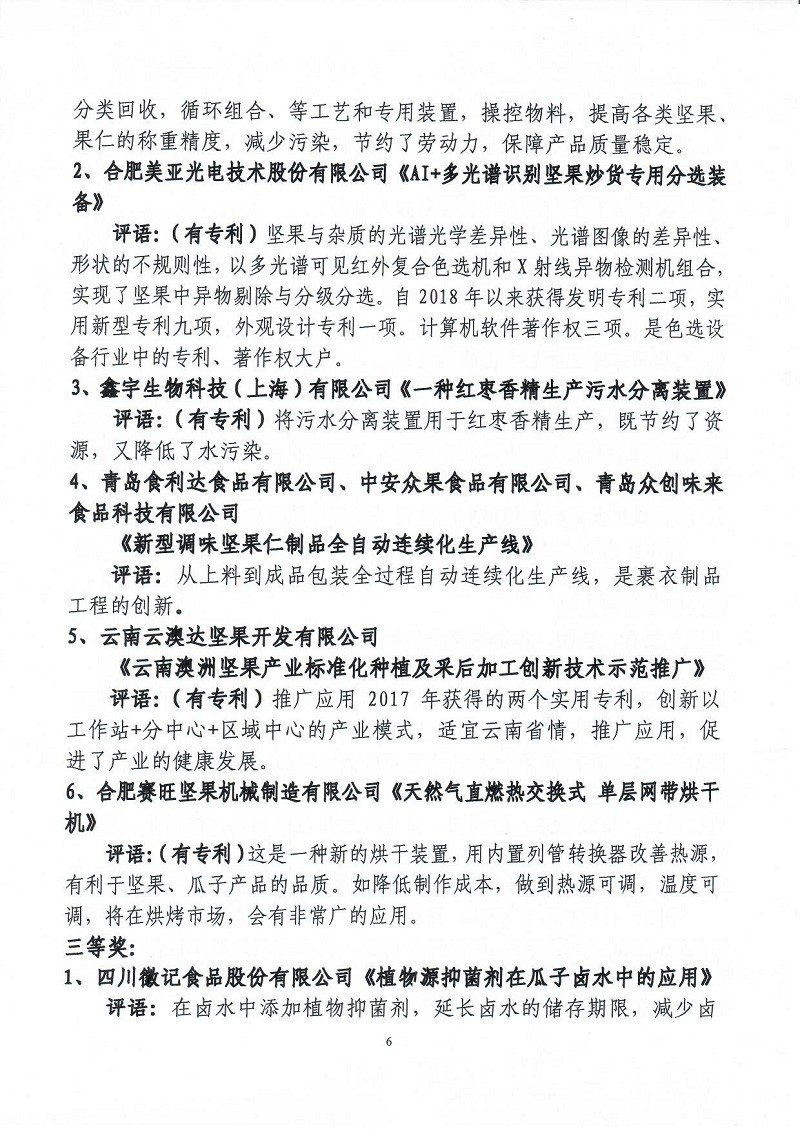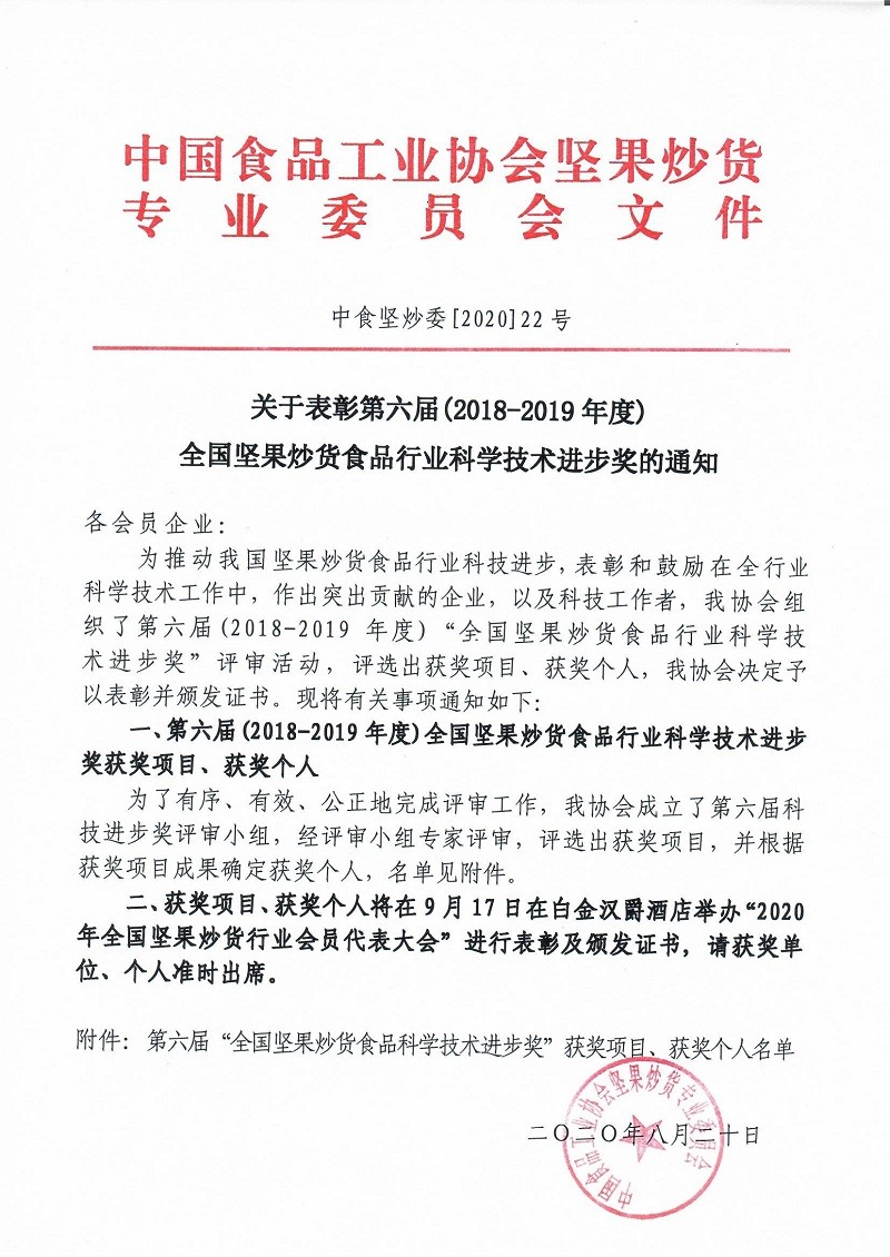 關(guān)于表彰第六屆(2018-2019年度)全國堅(jiān)果炒貨食品行業(yè)科學(xué)技術(shù)進(jìn)步獎的通知